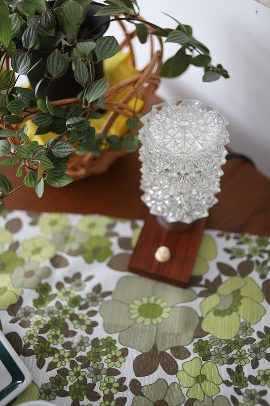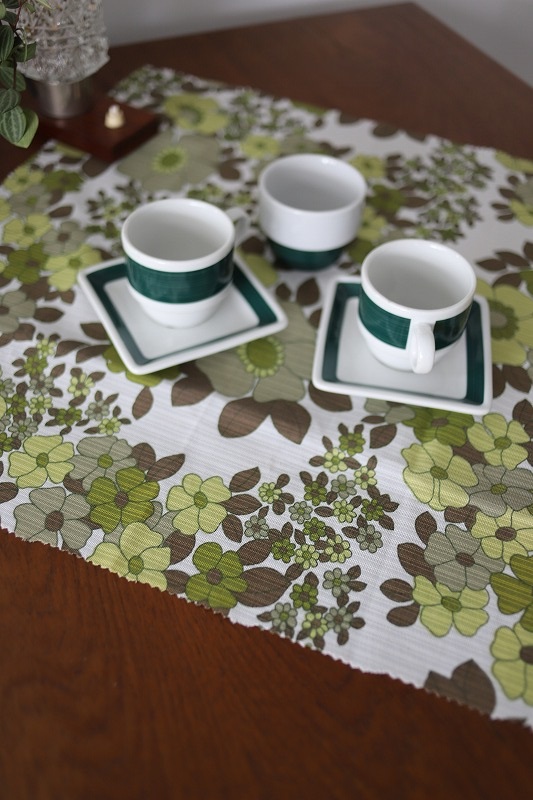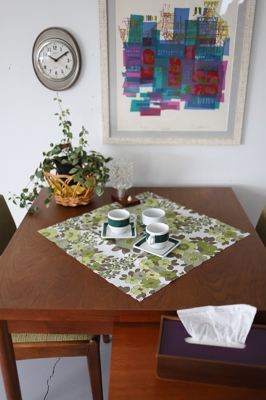 テーブルの中央にはヴィンテージファブリックのハギレをアレンジ♪