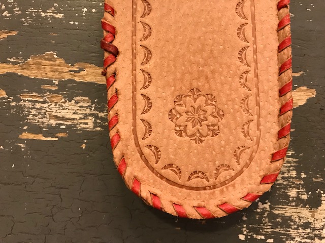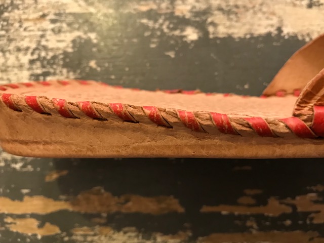 赤い革ひもでひと針ひと針縫いあげられたハンドメイドのスリッパです。