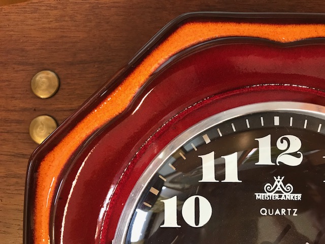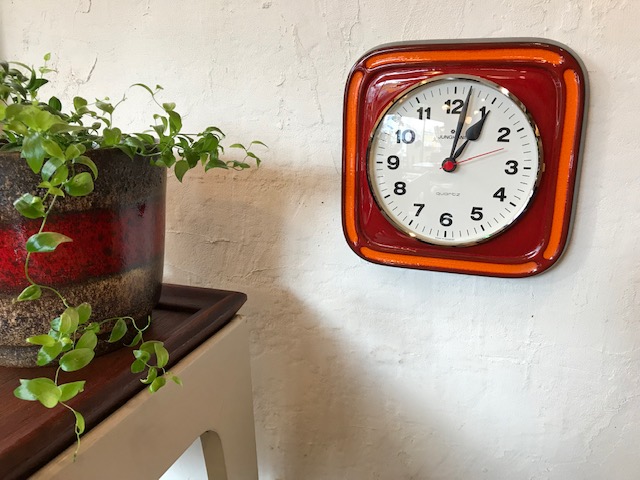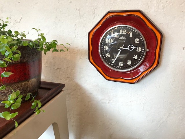 メリハリのある、赤とオレンジの艶やかな色合いがとても特徴的な掛時計です。