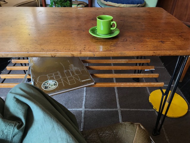無骨なガッシリとした天板に、黒くペイントされたアイアンの脚。カッコいい雰囲気のテーブル。