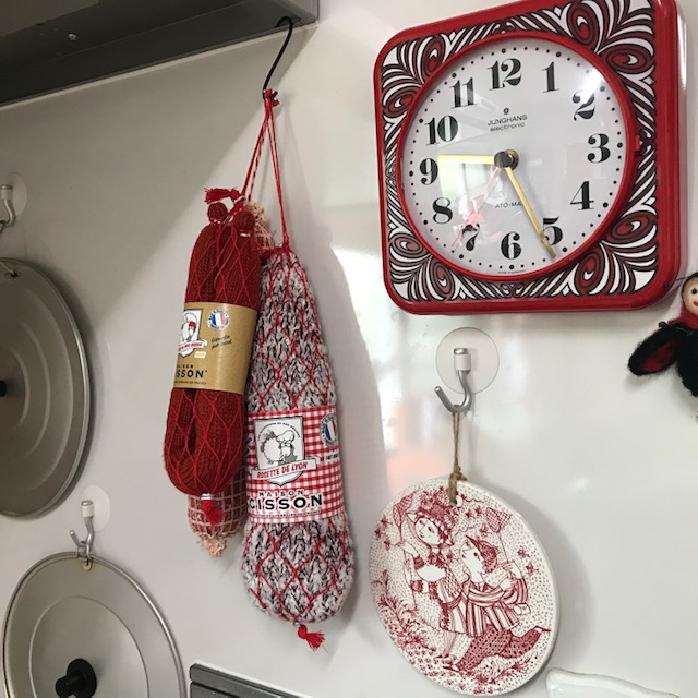 赤を基調としたキッチンに、これまた珍しいJunghans社のプラスチック製掛時計。