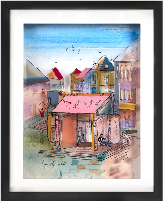 This whimsical painting celebrates the adventure and joy that stories bring.