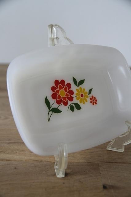 耐熱食器ミルクガラスで有名なフランスArcopal(アルコパル)の少し深さがあるお皿です。長方形型が良いです。フラワープリントがレトロで可愛い一点です。