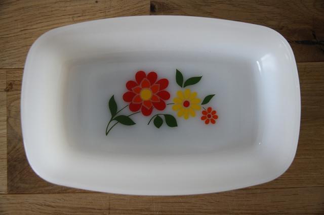 耐熱食器ミルクガラスで有名なフランスArcopal(アルコパル)の少し深さがあるお皿です。長方形型が良いです。フラワープリントがレトロで可愛い一点です。