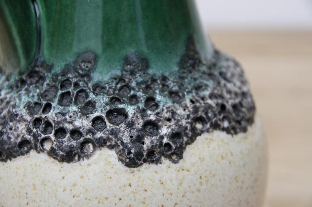 西ドイツにて製造されていたFatlavaという名がついた陶磁器、BAY Keramik社製のフラワーベースです。たまごのような形からスラリと伸びる口までのデザイン、濃い緑の色が目を惹きます。泡のような黒いボコボコとした釉薬の仕上がりもFatLavaらしい特徴が出ています。