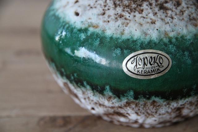 西ドイツにて製造されていた'Fat Lava'と呼ばれる陶磁器で、1848年創業と言われているJopeko社製のフラワーベースです。軽石のように凹凸ある釉薬と艶感ある鮮やかな緑の色のバランスが素敵な一点です。