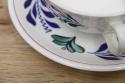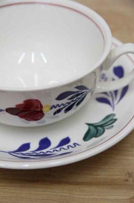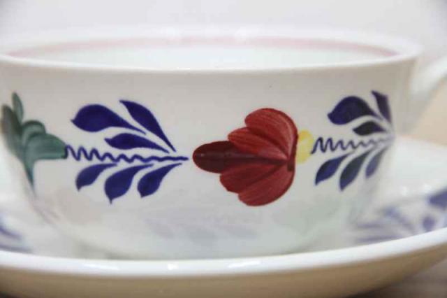 BOCH「Boerenbont」(製造年は1960年代から1980年代)シリーズのソーサー付きスープカップ。グリーン・ネイビー・バーガンディーの色で連なるようにボタニカルデザインがハンドペイントにて描かれている素敵な一点。とても状態が良いヴィンテージ品です。