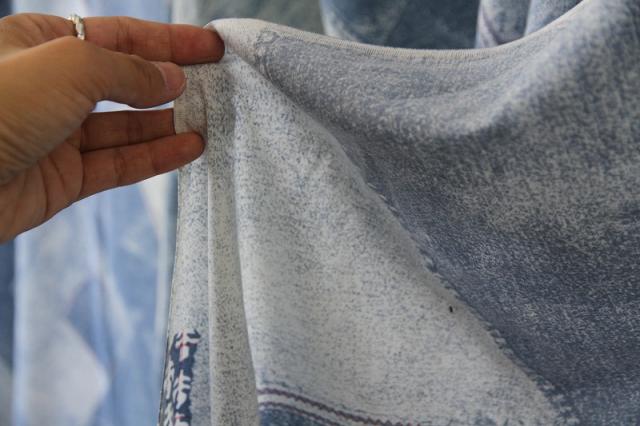 アメリカ買付便のヴィンテージファブリック。デニムのようなプリント模様のさらりとした質感の生地です。おおよそ正方形に仕立てられた状態で見つかりました。