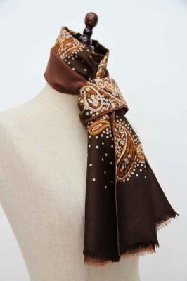 ヨーロッパから届いた長方形型のヴィンテージスカーフです。ブラウンベースの色合いで秋冬のファッションには持ってこい!なデザインです。レトロファッションを楽しみましょう。