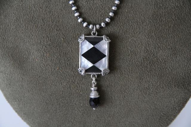 スターリングシルバー(シルバー925)に黒曜石と白蝶貝を象嵌したオニキスを組合わせたジュエリー。唯一無二の特別感を味わえるGEM KINGDOMのネックレスです。