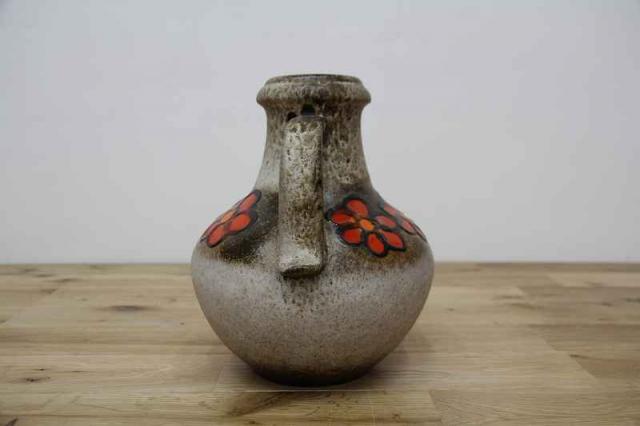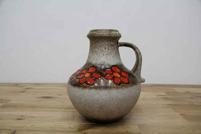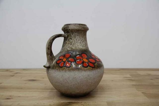 赤いお花が描かれた、賑やかなフラワーベース。西ドイツ生まれのFatLavaと呼ばれる陶磁器で、Scheurich社製のものです。どっしりとした重厚感あるデザイン。茶色ベースに映えるお花が目を惹きますね。お部屋を華やかに彩ってくれる花瓶です。
