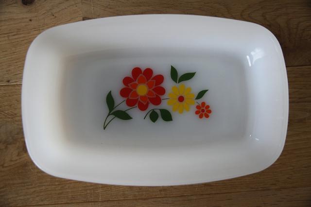 耐熱食器ミルクガラスで有名なフランスArcopal(アルコパル)の少し深さがあるお皿です。長方形型が良いです。フラワープリントがレトロで可愛い一点です。