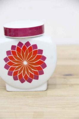 ドイツMelittaメリタ社製ヴィンテージのシュガーポット。ダリアのような大輪のフラワーモチーフが印象的。カラーグラデーションも美しいです。ちょっとした小物入れにも代用できそうです。