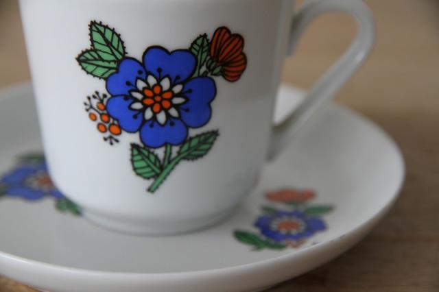 ドイツKAHLA社製のカップ&ソーサーです。レトロなフラワープリントの色使いが印象的です。