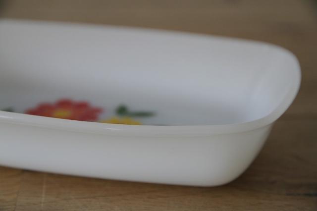 耐熱食器ミルクガラスで有名なフランスArcopal(アルコパル)の少し深さがあるお皿です。長方形型が良いです。フラワープリントがレトロで可愛い一点です。