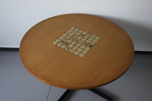 デザインのアクセントとしてテーブル天板にはタイルが埋め込まれています。脚は金属製です。脚先のカバーは2ヶ所ついていません。(詳細写真でお確かめください。)