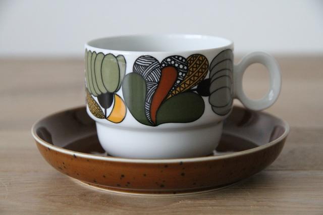 レトロなボタニカル柄がとても印象的なドイツRosenthal社製thomasの"Kiruna"シリーズのカップ&ソーサー。Rorstrandで活躍したHertha Bengtsonによるデザインです。