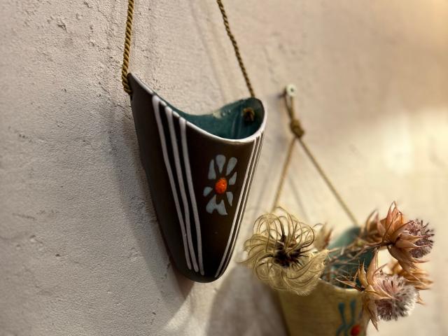 1960-70年代製ドイツのU-Keramik社のハンギングベースです。陶器製で、壁に付く面はしっかりと安定するつくりになっています。