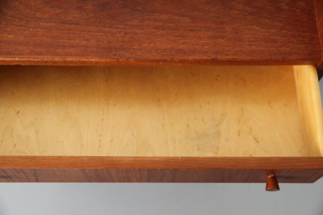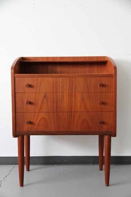 北欧デンマーク製のチーク材を使用した3段チェスト。3杯の引き出しを備え収納力もあり、上段も2段に分かれているつくりです。シンプルながらもデザイン性を兼ね備えた一台です。