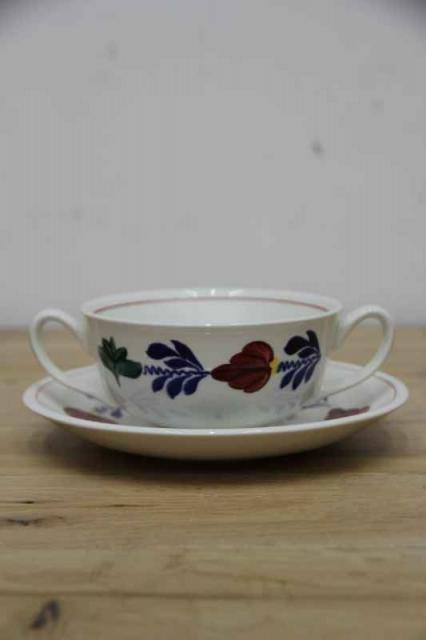 BOCH「Boerenbont」(製造年は1960年代から1980年代)シリーズのソーサー付きスープカップ。グリーン・ネイビー・バーガンディーの色で連なるようにボタニカルデザインがハンドペイントにて描かれている素敵な一点。とても状態が良いヴィンテージ品です。