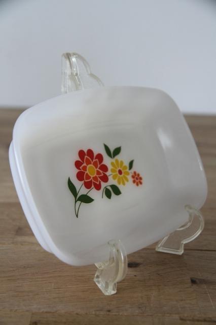 耐熱食器ミルクガラスで有名なフランスArcopal(アルコパル)の少し深さがあるお皿です。長方形型が良いです。フラワープリントがレトロで可愛い一点です。