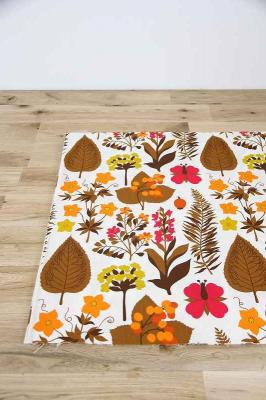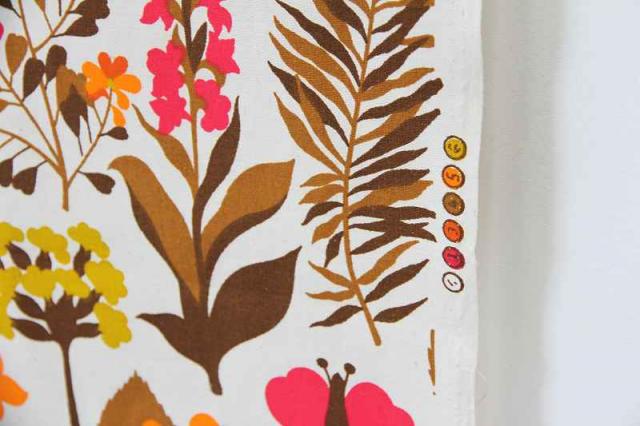 ドイツで見つけたボタニカル柄のヴィンテージファブリックです。全体的に草花がプリントされた生地。日本だったら、紅葉シーズンにピッタリすぎる色合いですね。カーテンやタペストリーなど、お部屋のインテリアに取り入れることもおススメです。