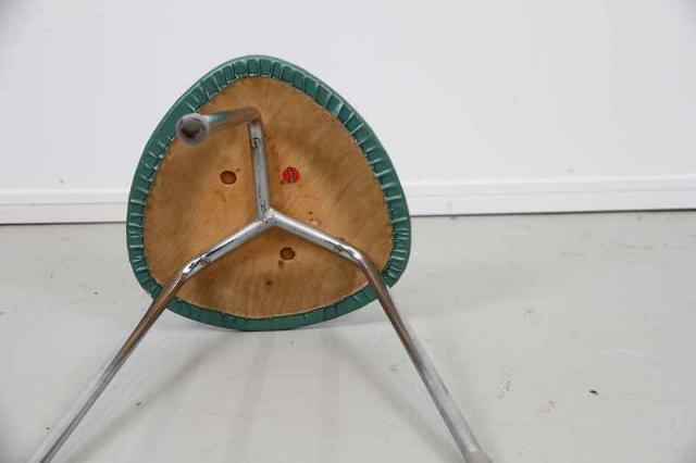 ドイツで見つかったヴィンテージスツールです。三角形の座面にスチール製の脚が付いています。座面のエメラルドグリーンの色がとても綺麗です。小ぶりで使いやすいスツールです。
