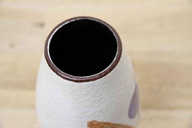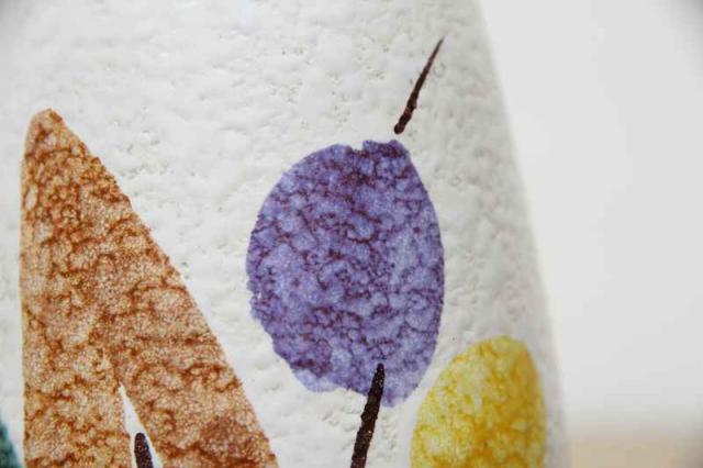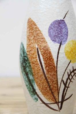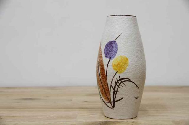 ドイツ製ヴィンテージの陶器製フラワーベースです。野に咲いていたお花だったのでしょうか、植物が素敵に描かれています。筆のタッチや線の強弱など、細かく見れば見るほど思わず見入ってしまうデザインは、絵画を飾るような気持ちでお部屋を彩りたくなる花瓶ですよ。