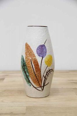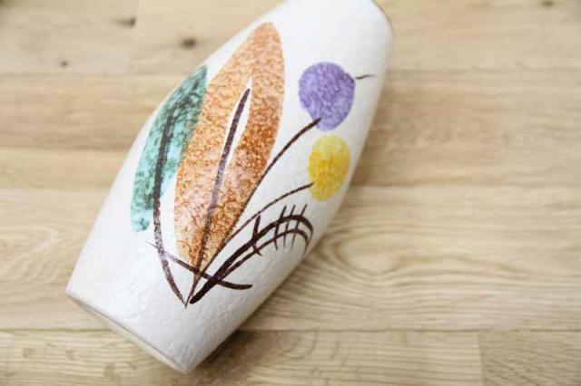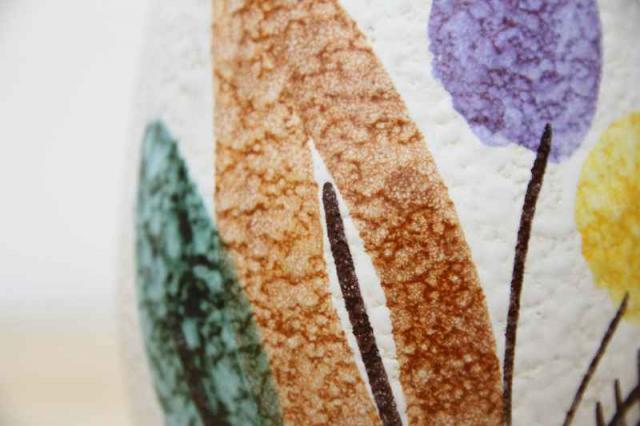 ドイツ製ヴィンテージの陶器製フラワーベースです。野に咲いていたお花だったのでしょうか、植物が素敵に描かれています。筆のタッチや線の強弱など、細かく見れば見るほど思わず見入ってしまうデザインは、絵画を飾るような気持ちでお部屋を彩りたくなる花瓶ですよ。