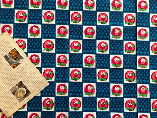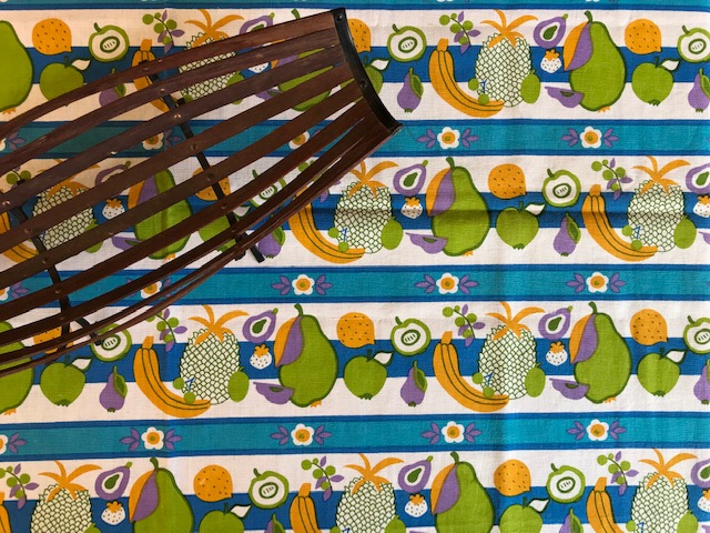 太陽のような賑やかなフラワープリントが素敵なヴィンテージファブリック。オランダで見つかったものです。ジャージ素材のような、伸びやすい質感です。ブラッドオレンジのような色にグリーンの配色がなんとも賑やかで明るい気持ちにさせてくれるデザインです。