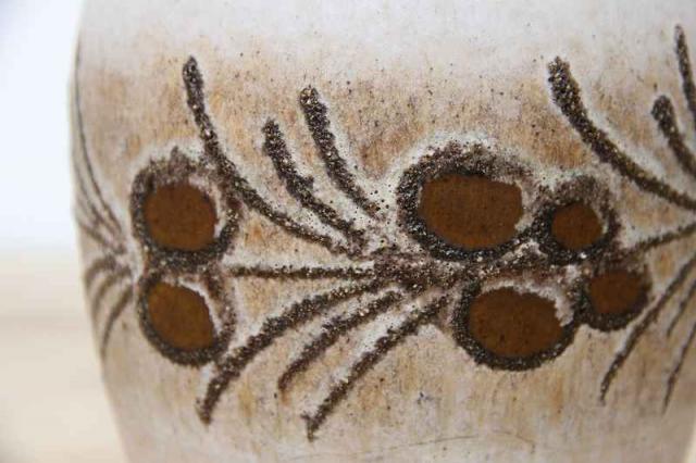 ドイツ製のヴィンテージフラワーベースです。陶器製です。木の実のような模様が立体的にぐるりと描かれています。ずっしりと丸い、安定感あるフォルムです。口が小さいので、一輪挿しにも向いていると思います。全体的に落ち着いた渋い雰囲気の花瓶なので、お部屋に合わせやすく、和室インテリアにもおススメです。