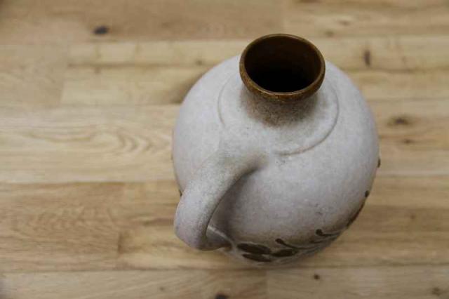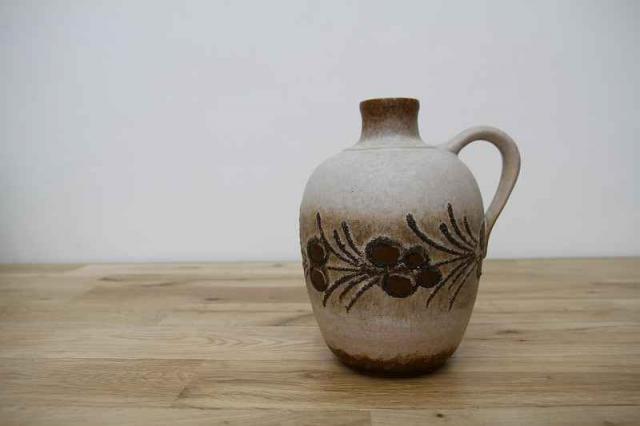 ドイツ製のヴィンテージフラワーベースです。陶器製です。木の実のような模様が立体的にぐるりと描かれています。ずっしりと丸い、安定感あるフォルムです。口が小さいので、一輪挿しにも向いていると思います。全体的に落ち着いた渋い雰囲気の花瓶なので、お部屋に合わせやすく、和室インテリアにもおススメです。