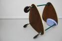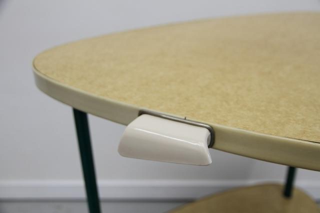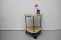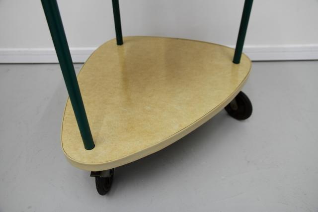 1950'sのレトロな2段ワゴンです。三角形の天板がとてもユニーク。美容室用のテーブルだったようです。オリジナルのキャスターも動きがよく、とても状態が良いです。小さなトレイの収納スペースの水色や、支柱となる緑のパーツ、色の組み合わせもとても可愛らしい、ヴィンテージならではの雰囲気がありますね。