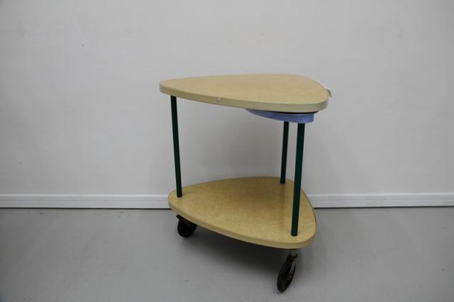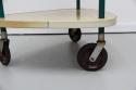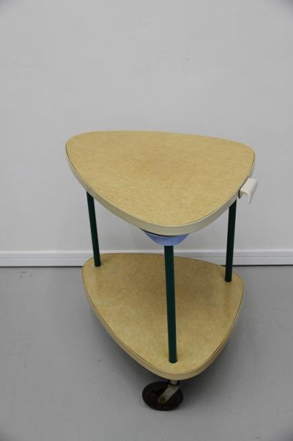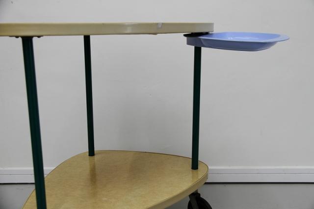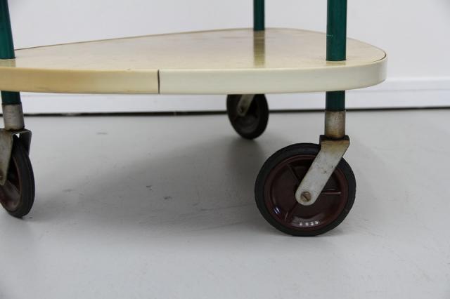 1950'sのレトロな2段ワゴンです。三角形の天板がとてもユニーク。美容室用のテーブルだったようです。オリジナルのキャスターも動きがよく、とても状態が良いです。小さなトレイの収納スペースの水色や、支柱となる緑のパーツ、色の組み合わせもとても可愛らしい、ヴィンテージならではの雰囲気がありますね。