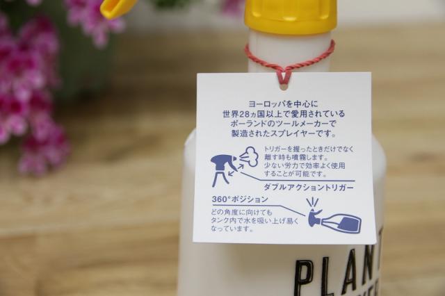 ヨーロッパを中心に広く愛用されている、ビビットカラーがアクセントのスプレイヤーです。使い勝手の良いポイントのひとつは、ダブルアクショントリガー仕様なのでトリガーを握った時だけではなく、離すときにも噴霧できること。少ない労力で作業が済みますし、霧の噴出範囲を変えられるノズルもついています。もうひとつは、360°どのポジションからも水を吸い上げやすいことです。水を吸い上げるノズルは柔軟性があり、先には重りが付いているのでタンクの内の水をすい上げやすい作りになっています。