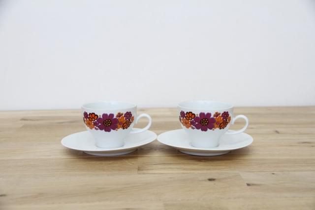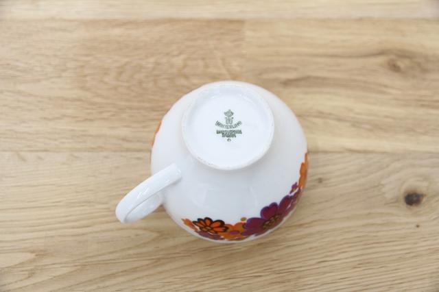 ドイツの陶磁器メーカー‘Winterling’社のカップ&ソーサーです。オレンジと紫色のコスモスのようなお花がとてもレトロで可愛いプリントデザイン。ソーサーがとてもシンプルなので、お花が際立つデザインですね。