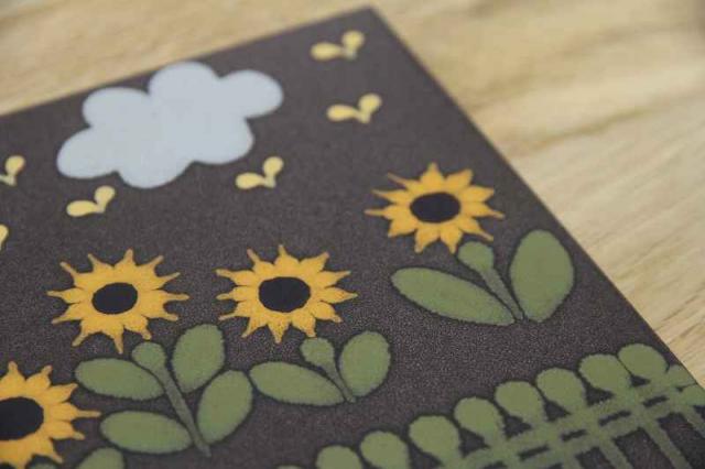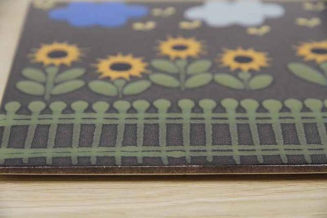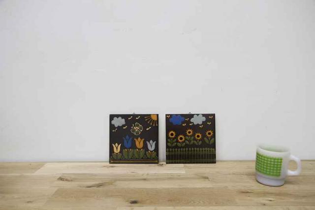 ドイツ製ヴィンテージのタイルの壁飾りです。太陽の光を浴びながら元気に育っている向日葵のようなお花が並んだデザイン。おそらくですが、前の持ち主さんがタイルを壁飾り用にカスタムしたのではないかと思います。壁が傷つかないように、コルクが貼ってあったり、大事にモノを扱う人だったのではないかなぁと、勝手に想像しています。