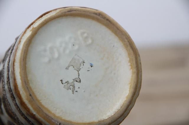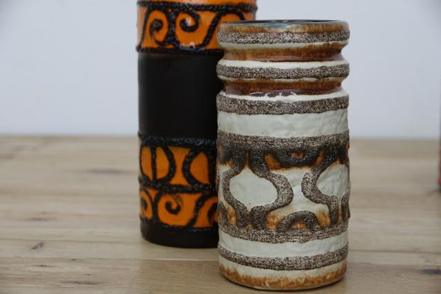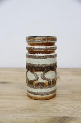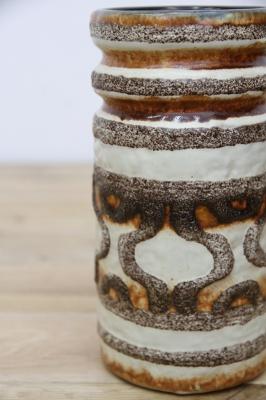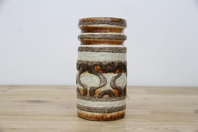 VEB Haldensleben社製のヴィンテージ品と思われます。東ドイツに拠点があった国営工場です。西ドイツ製のFatLavaに比べると落ち着いた雰囲気を感じます。白と茶色ベースのあたたかみあるボディに、凹凸感ある釉薬で縁取りされたような独特なデザインです。