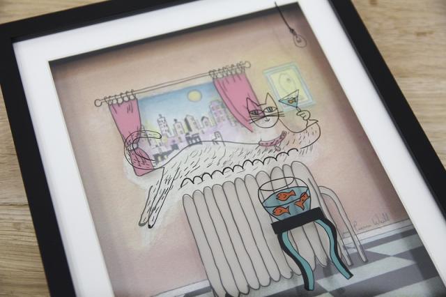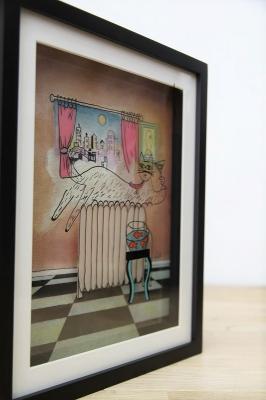 このユーモラスな夢では、猫は家の中に一人で残され、ラジエーターに快適に張られた寝酒を楽しんでいます。 彼の猫の想像力は家の装飾を彼の個人的な好みに再配置しました。