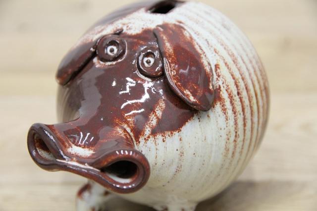 ドイツから届いたブタの貯金箱。陶器製です。フニャンと曲げられれた鼻がなんとも特徴あるデザインになっていますね。取り出し口はありませんので、お金が貯まったら・・・、そのままにしましょう:)