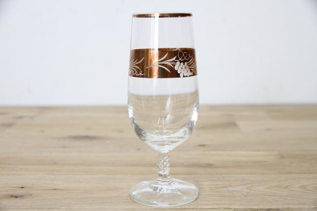 ドイツから届いたヴィンテージのワイングラス。ゴールドの帯に描かれた葡萄は、切子細工のようにガラスをカットされたデザイン。脚部分のガラスもカットされていて、大変美しいフォルムです。