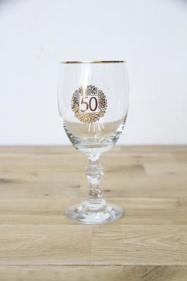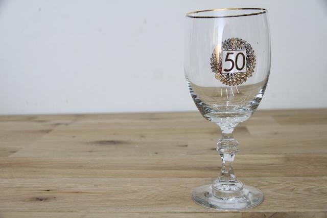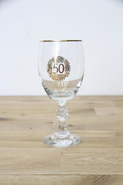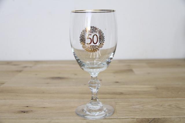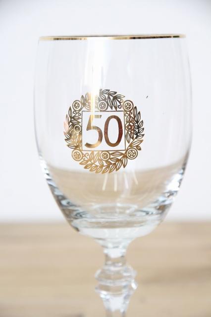 ドイツで見つかったヴィンテージの脚付きグラス。デコレーションされた50の文字、なにかの記念品だったのでしょうか。50歳のお誕生日、ご結婚50年のお祝い、創業50年のお祝いなどなど、ギフトにもおススメです。