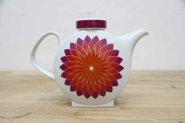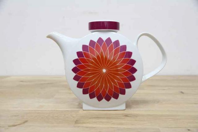 ドイツMelittaメリタ社製ヴィンテージのコーヒーポット。なんといっても目を惹くのはダリアのような大輪のフラワーモチーフプリントと、まんまるボディでしょうか。横からみると案外スリム。インテリアとしても映えるコーヒーポットです。