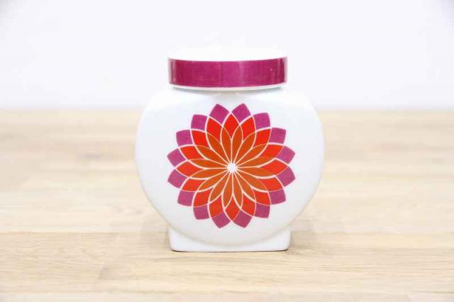 ドイツMelittaメリタ社製ヴィンテージのシュガーポット。ダリアのような大輪のフラワーモチーフが印象的。カラーグラデーションも美しいです。ちょっとした小物入れにも代用できそうです。