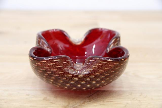 1970年代製のMuranoGlassの灰皿(ボウル)です。ずっしりとした重みと、ガラスの美しい赤の色の中には金粉の含有物。とても高貴な雰囲気を醸し出しています。ガラスの塊の中に気泡を閉じ込める技法も大変高度な技術を要するそうです。