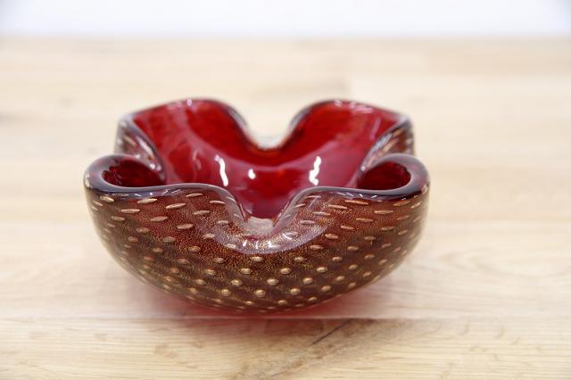 1970年代製のMuranoGlassの灰皿(ボウル)です。ずっしりとした重みと、ガラスの美しい赤の色の中には金粉の含有物。とても高貴な雰囲気を醸し出しています。ガラスの塊の中に気泡を閉じ込める技法も大変高度な技術を要するそうです。