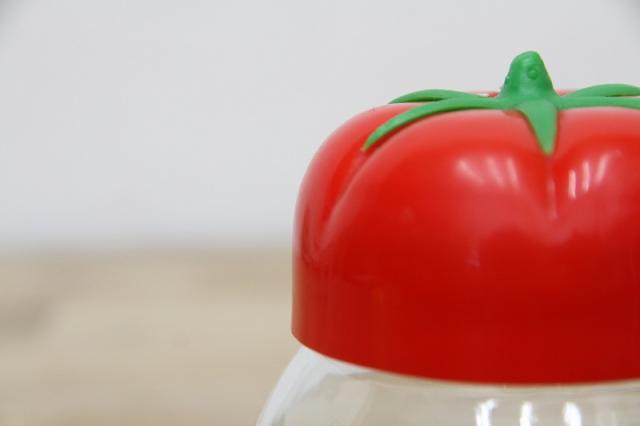 ドイツから届いた可愛いキャニスター。ガラス瓶にプラスチック製のトマトの蓋というデザイン。レトロ感満載な入れ物です。