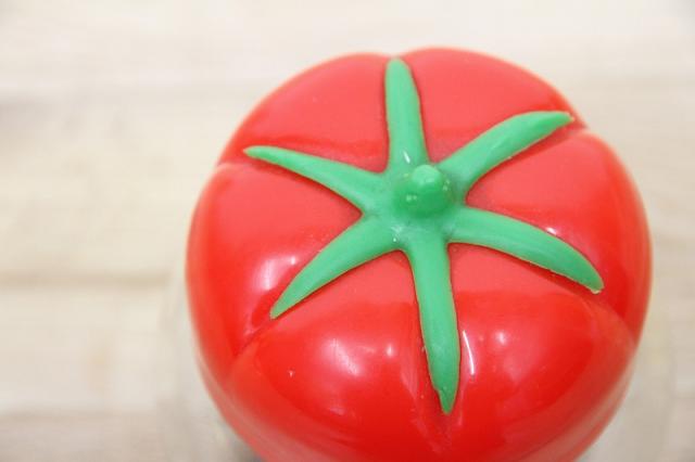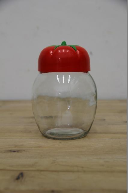 ドイツから届いた可愛いキャニスター。ガラス瓶にプラスチック製のトマトの蓋というデザイン。レトロ感満載な入れ物です。
