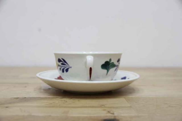 BOCH「Boerenbont」(製造年は1960年代から1980年代)シリーズのソーサー付きスープカップ。グリーン・ネイビー・バーガンディーの色で連なるようにボタニカルデザインがハンドペイントにて描かれている素敵な一点。とても状態が良いヴィンテージ品です。