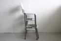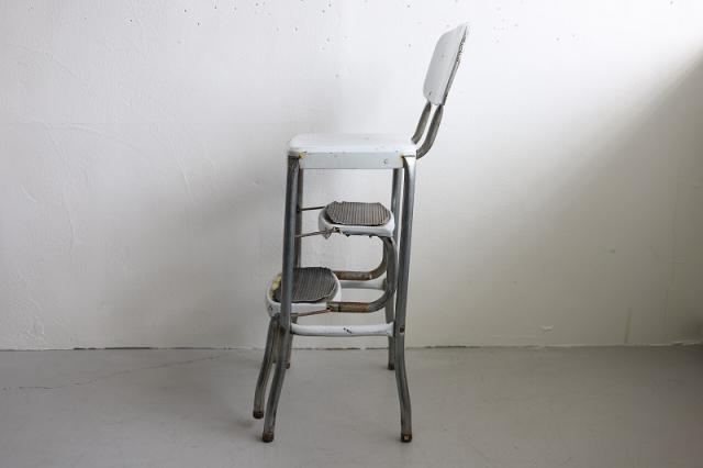 アメリカ買付のメタルステップスツールです。座面下のステップを手前日引き出すと小さな脚立に早変わり。スツールと脚立が一体化した実用的なアイテムです。例えばキッチンに置いて高いところに手を伸ばしたいときのステップ利用はとても便利ですし、他、カウンターやガレージ、お花を置く台としてなど、様々な用途で使える家具です。
